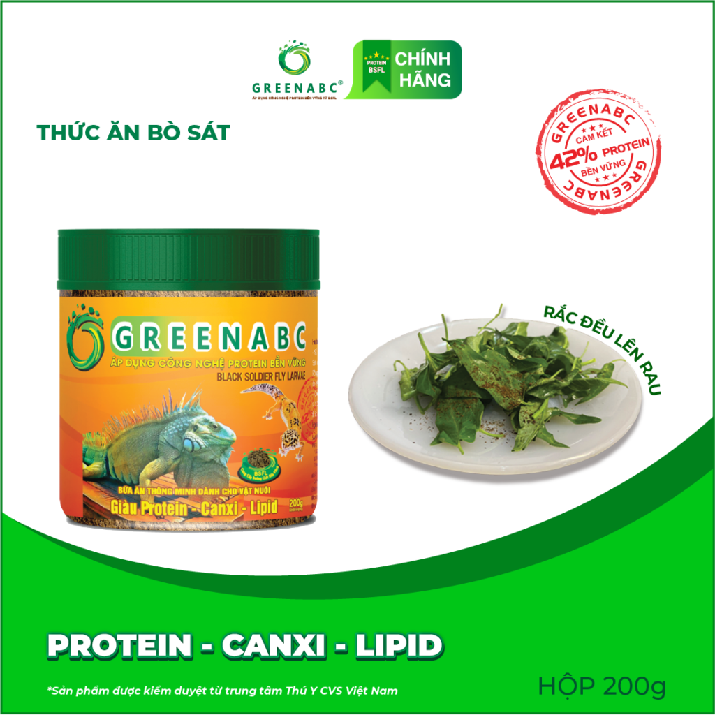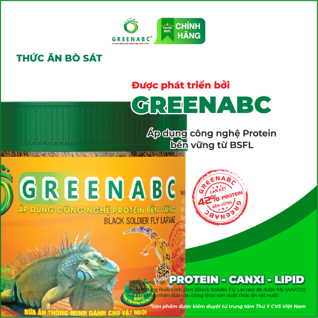 Đặc biệt sản phẩm GREENABC được sản xuất theo phương pháp Áp dụng công nghệ PROTEIN BỀN VỮNG từ bột đạm G.Meal rất giàu PROTEIN–CANXI–LIPID có trong BSFL, đã được Mỹ (AAFCO) và EU chấp nhận đưa vào công thức cho ngành sản xuất thức ăn dành cho thú cưng.