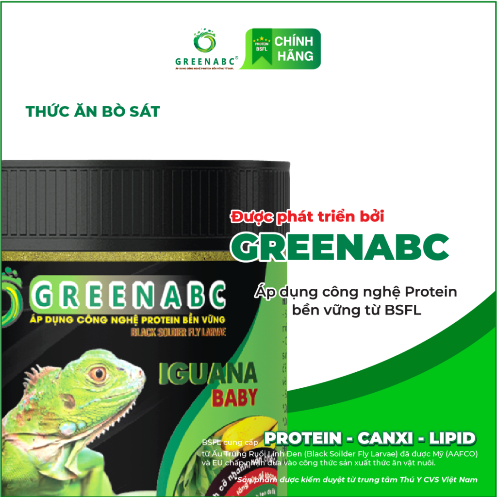 Đặc biệt sản phẩm GREENABC được sản xuất theo phương pháp Áp dụng công nghệ PROTEIN BỀN VỮNG từ bột đạm G.Meal rất giàu PROTEIN–CANXI–LIPID có trong BSFL, đã được Mỹ (AAFCO) và EU chấp nhận đưa vào công thức cho ngành sản xuất thức ăn dành cho thú cưng.